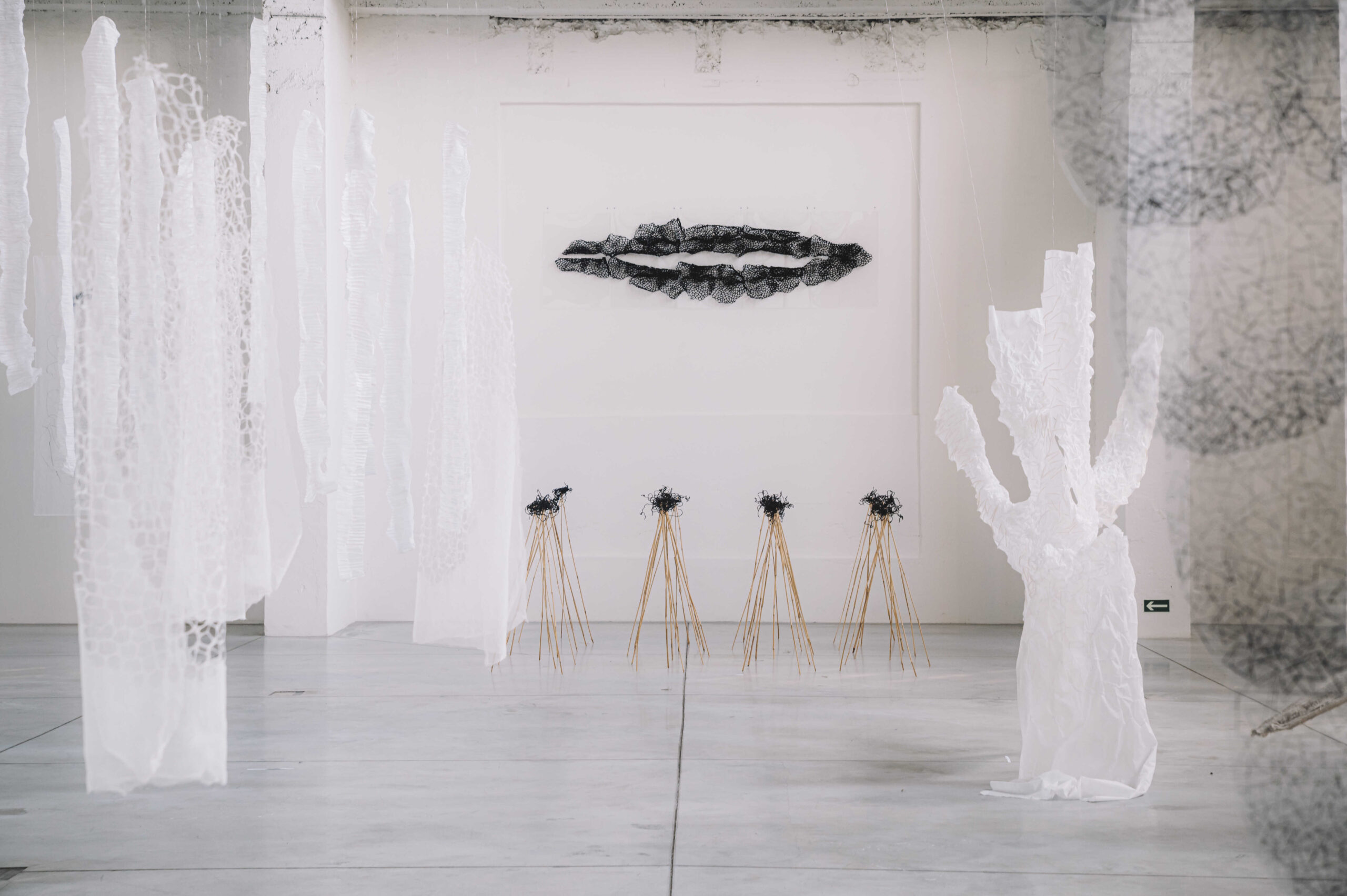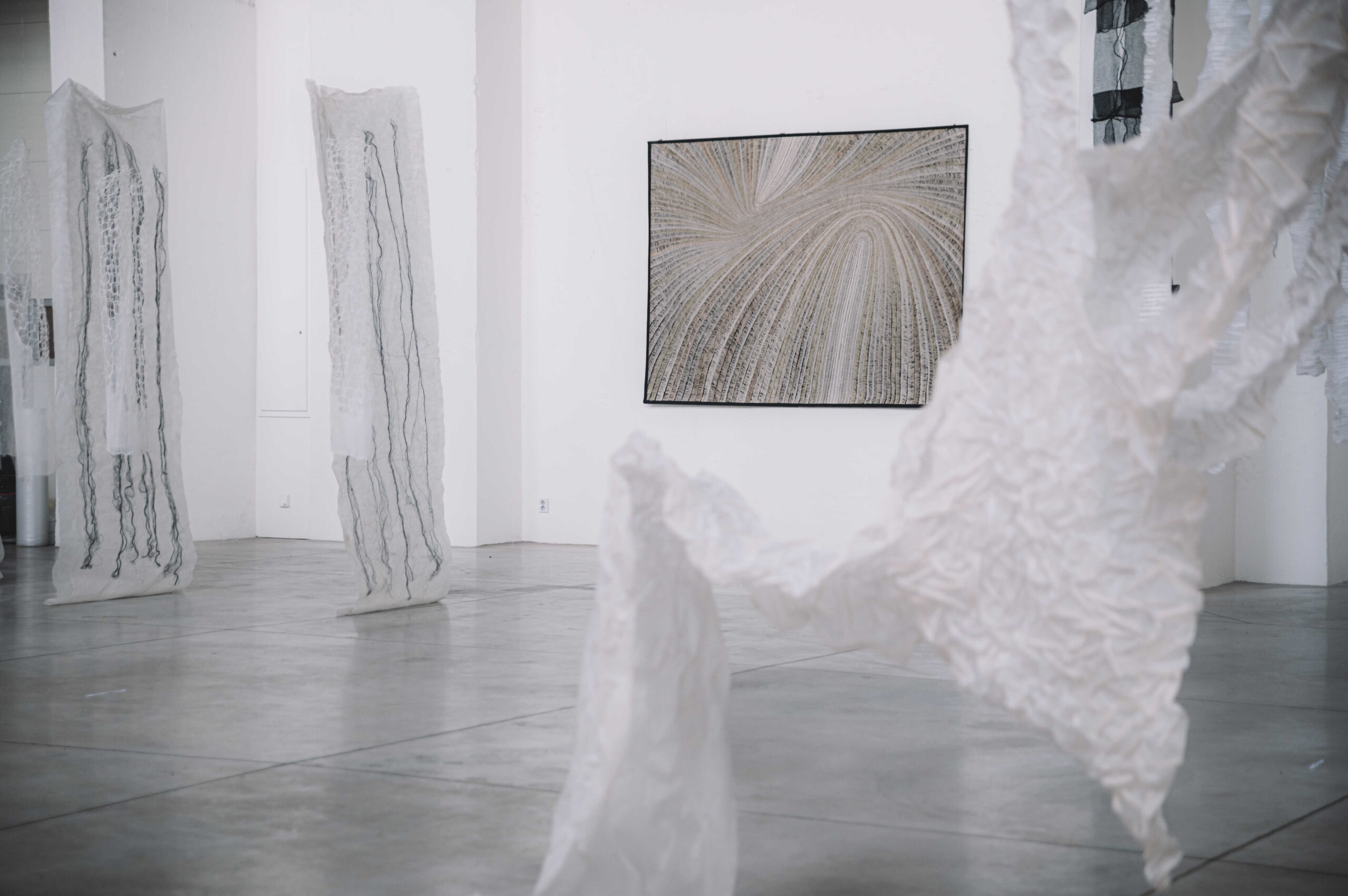 Výstava Křehkost a síla vlákna představuje průřez celoživotní tvorbou Evy Damborské. Autorčina tvorba vychází z hluboce zakotvené ženské zkušenosti – ze schopnosti naslouchat, vnímat proměnlivost a trpělivě vrstvit smysl tam, kde jiní vidí jen povrch. Umělkyně pracuje s vláknem jako s výtvarným i existenciálním médiem, skrze které tematizuje ticho, péči, paměť i cyklickou sílu života. Vlákno je zde nejen nositelem tvaru, ale i času, vztahů, paměti a zranitelné krásy života. Inspiraci čerpá Damborská především z přírody – z neviditelných rytmů růstu a rozpadu, z organických struktur pavučin, hnízd, kokonů či jemných rostlinných buněk. Autorka s lehkostí překračuje hranice tradičních textilních technik. Její díla nejsou jen artefakty, ale spíše organické kompozice, kde se tkaní, vyšívání, vrstvení a prostorová stavba prolínají v jeden celek. Křehkost a síla vlákna nabízí prostor k zastavení a naslouchání – jemným rytmům péče, neviditelné práci, tichému úsilí, které často zůstává skryto, a přesto drží vše pohromadě. V syrovém prostoru Turbínové haly kontrastuje surovost architektury se subtilností struktur, jako připomínka, že právě to nejtišší a nejkřehčí v sobě často ukrývá tu největší sílu – sílu tvořit, chránit a proměňovat.