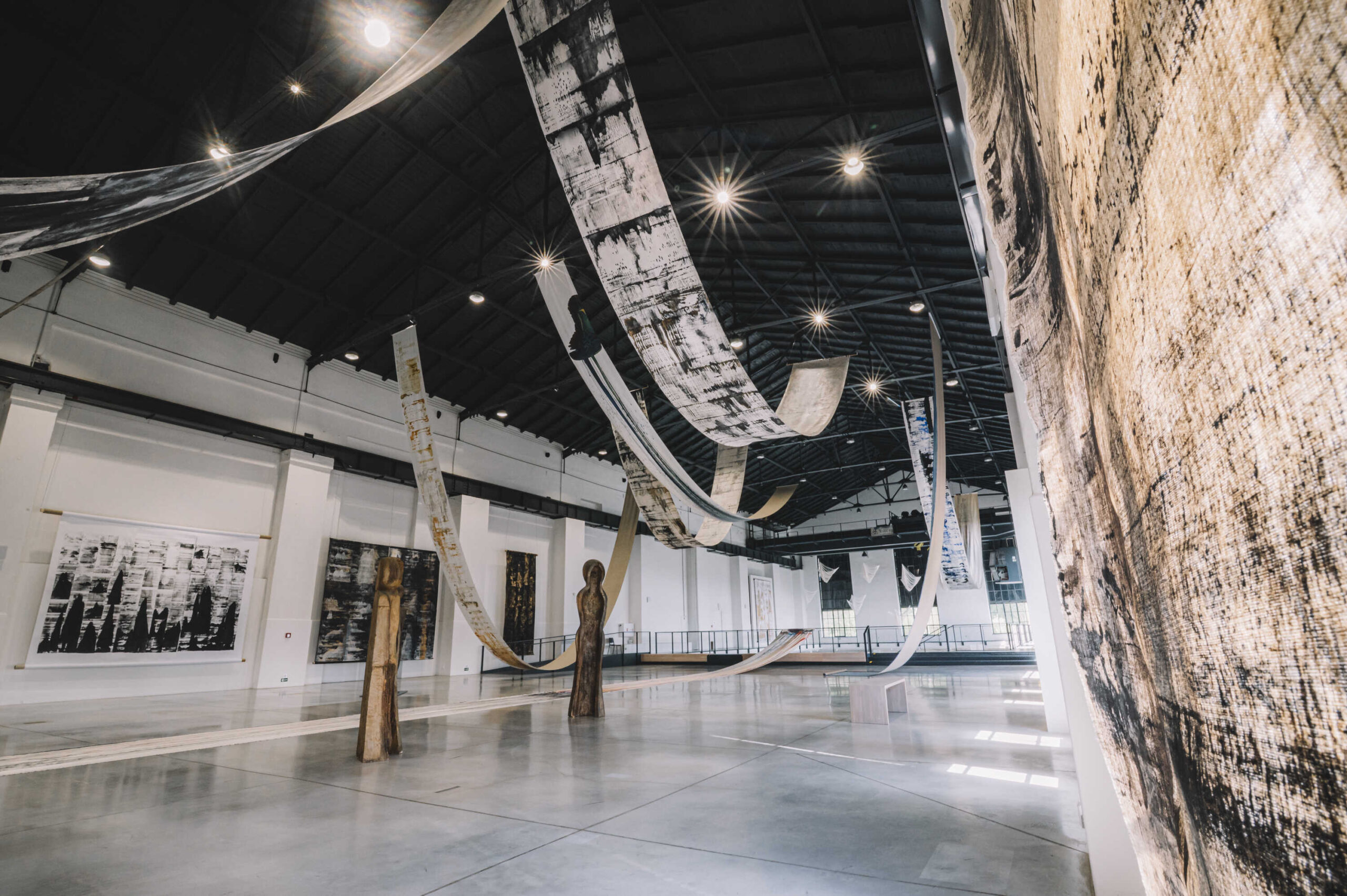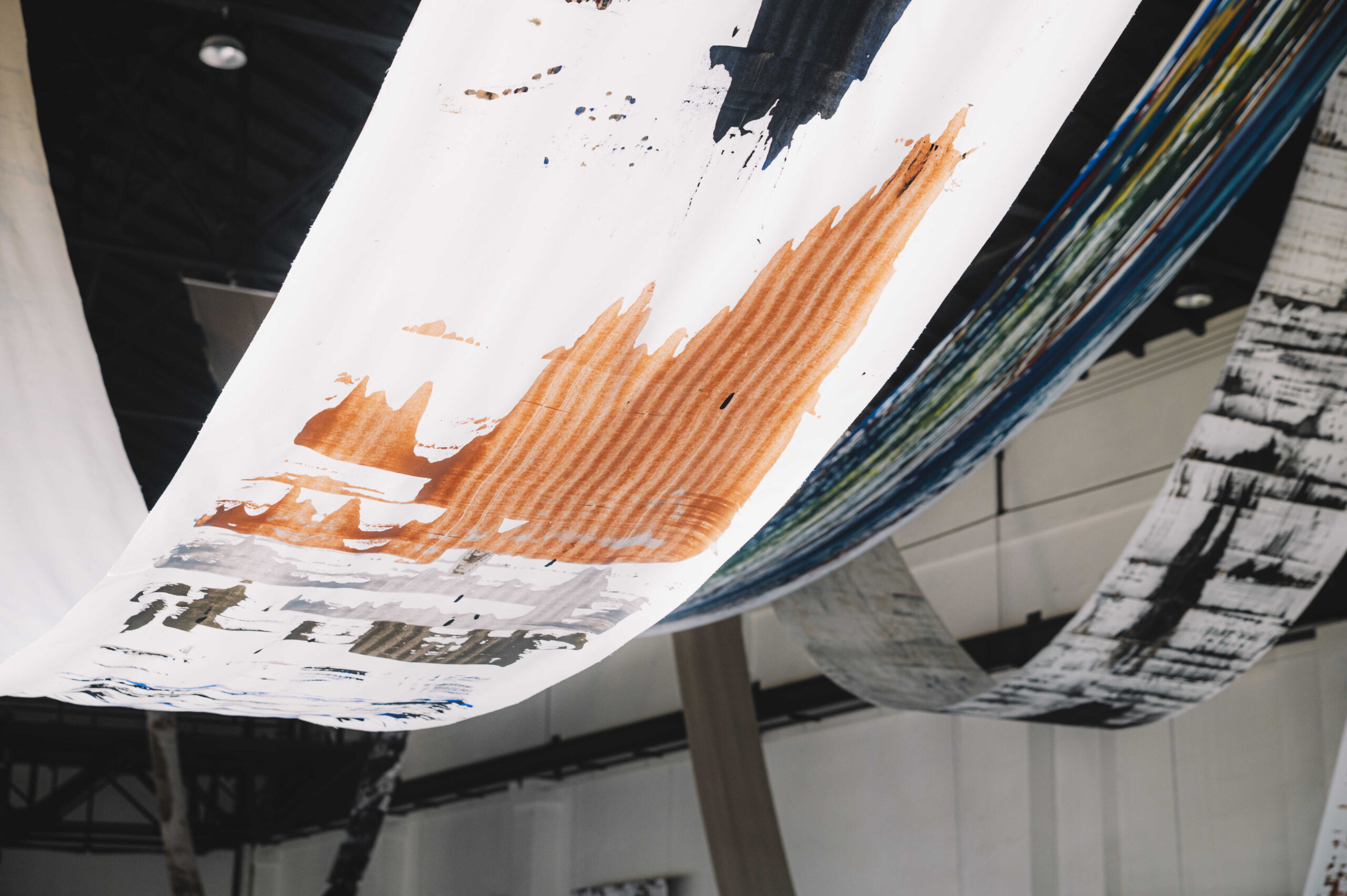Oči mezi horami Patrika Hábla v Centru současného umění EPO1 není klasickou přehlídkou obrazů. Je to monumentální krajina malby, v níž se díváme nikoli pouze očima, ale celým tělem. Autor proměňuje Turbínovou halu galerie v rozprostřený vizuální organismus – jeho svitky se vznášejí jako vlny, i jako hory. Krajina malby se zde neodehrává jen na povrchu, ale prorůstá samotnou strukturou prostoru. V srdci této instalace se nachází cyklus desítek ženských tváří. Vznikaly po léta, technikou alla prima – jedním intuitivním gestem, bez korekcí, jako polibek, který trvá zlomek vteřiny, ale pamatujeme si ho celý život. Nejde o portréty v klasickém slova smyslu. Jsou to tváře archetypální, zrozené z paměti, z hluboké vrstvy vědomí i podvědomí. Hábl skrze tvář sleduje sedimenty času, zachycuje proměnu i stálost. Tvář zde není jen obraz – je znakem, šifrou, zrcadlem vnitřních krajin. Zásadní roli v Háblově tvorbě hraje technika „vytrhávání“ – destruktivní akt, kterým se malíř dostává pod kůži obrazu. Vytržené vrstvy odhalují spodní strukturu malby, jako by se snažil dosáhnout až na kost. Oči mezi horami nejsou výstavou. Jsou prostorem, v němž malba přestává být obrazem a stává se zkušeností. Zážitkem, který vám vleze pod kůži jako dobrá báseň. A možná vás už nikdy nepustí.